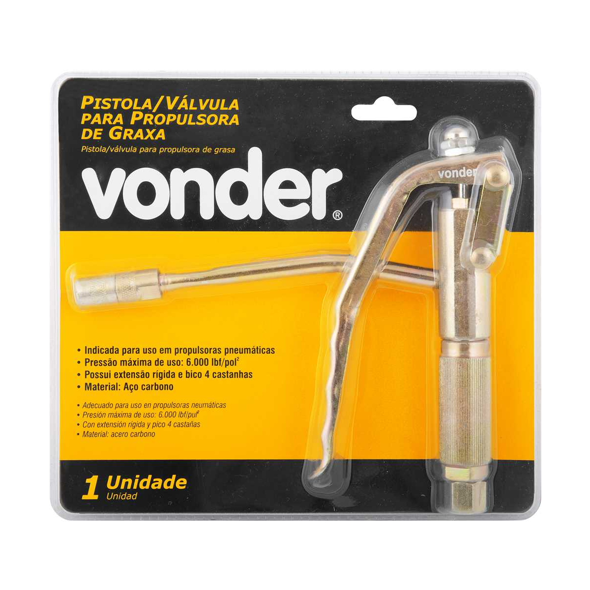 Pistola/válvula Vonder para propulsora de graxa, indicada para controle da aplicação de graxa sob pressão em sistemas de lubrificação. Possui estrutura reforçada, garantindo durabilidade e eficiência no uso profissional e industrial.